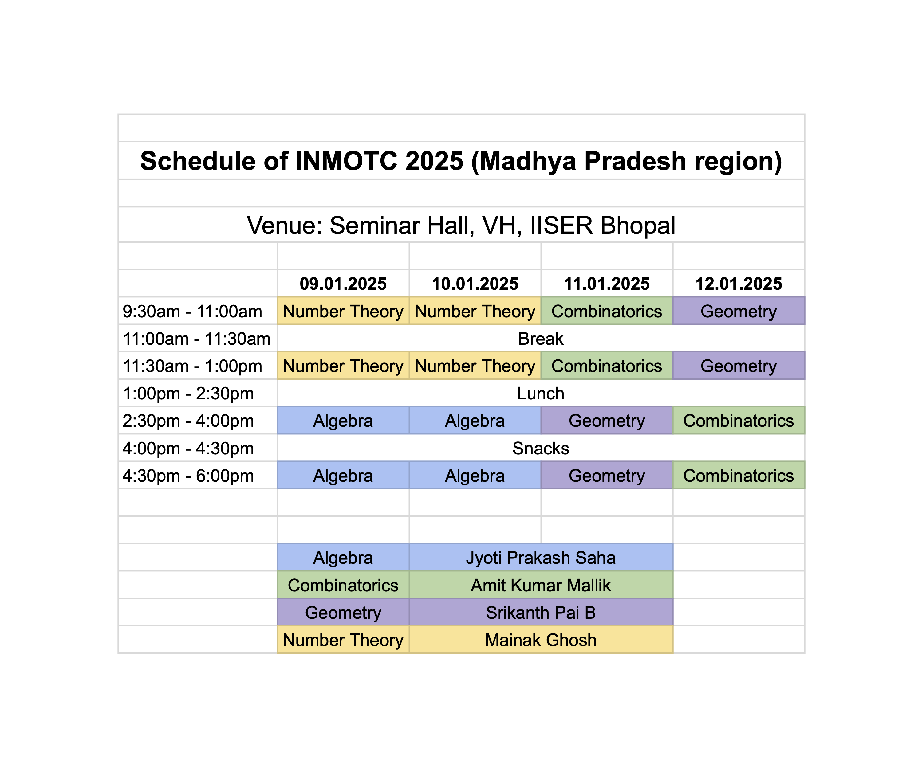 The INMO Training Camp 2025 for the Madhya Pradesh region was held at IISER Bhopal from 09.01.2025 to 12.01.2025.